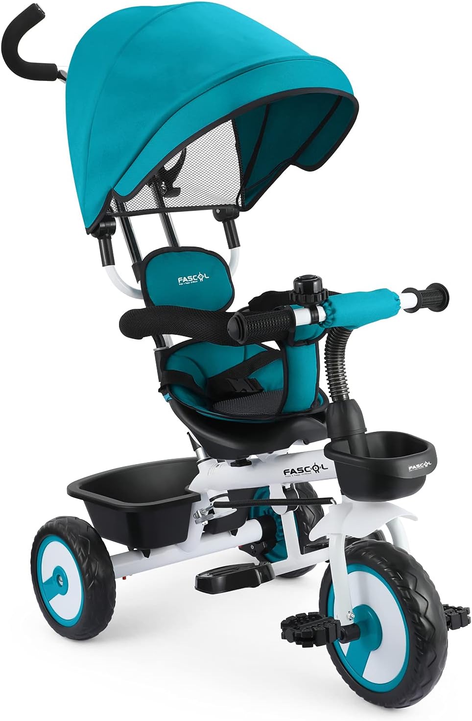 The Fascol Baby Trike 4-in-1 is a robust, CE & ASTM certified tricycle designed for children aged 12 months to 5 years. Featuring a height-adjustable parent push handle with steering linkage, eco-friendly EVA wheels, and a sturdy aluminum alloy frame, it ensures durability and smooth rides on varied terrains. Comfort and safety are prioritized with a retractable canopy, 2-point safety belts, safety fence, and foldable footrest. Additional conveniences include a front basket, rear storage bin, bell, and foot brake, making it the perfect outdoor companion for growing kids and their parents.